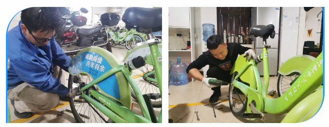 为圆满完成本次保养任务,按照公司领导“认真细致、不图进度,安全至上、质量第一”的指示要求,湘盾公共自行车公司多个工种之间密切配合——巡检员在站点为车辆做全面“体检”,并负责为车辆“美容”(消毒、清洁);客服发出站点调度指令,司机调度负责运输;维修员开展全面排查和保养维修(润滑转动系统,更换磨损零部件),对车辆上的反光装置进行升级,提升夜间行车安全。全体维修队员更是毫无怨言地加班加点,公共自行车大保养工作高效有序。