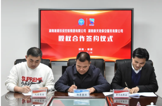 12月28日下午5时18分,湖南湘盾投资控股集团有限公司(以下简称湘盾集团)与湖南新天地保安服务有限公司(以下简称湖南新天地保安公司)举行股权合作签约仪式。